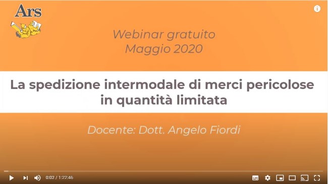 E’ disponibile sul nostro canale youtube (a cui vi invitiamo ad iscrivervi) il video del WebinARS gratuito organizzato da ARS Edizioni informatiche, dal titolo LA SPEDIZIONE INTERMODALE DI MERCI PERICOLOSE IN QUANTITÀ LIMITATA (Docente Dr. Angelo Fiordi)