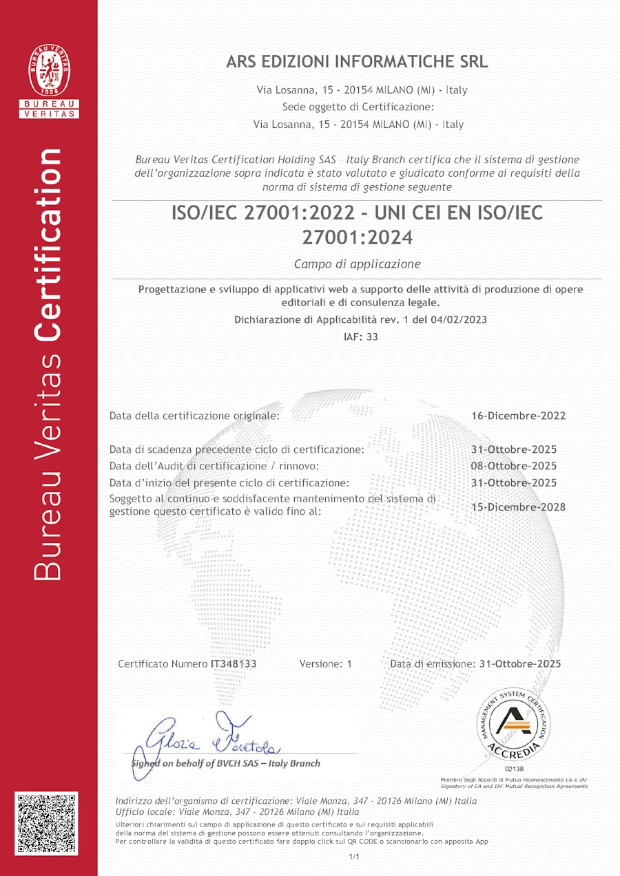 Bureau Veritas Italia S.p.A. ha certificato che il Sistema di Gestione di ARS Edizioni informatiche, è conforme ai requisiti della norma: ISO/IEC 27001:2022 UNI CEI EN ISO/IEC 27001:2024